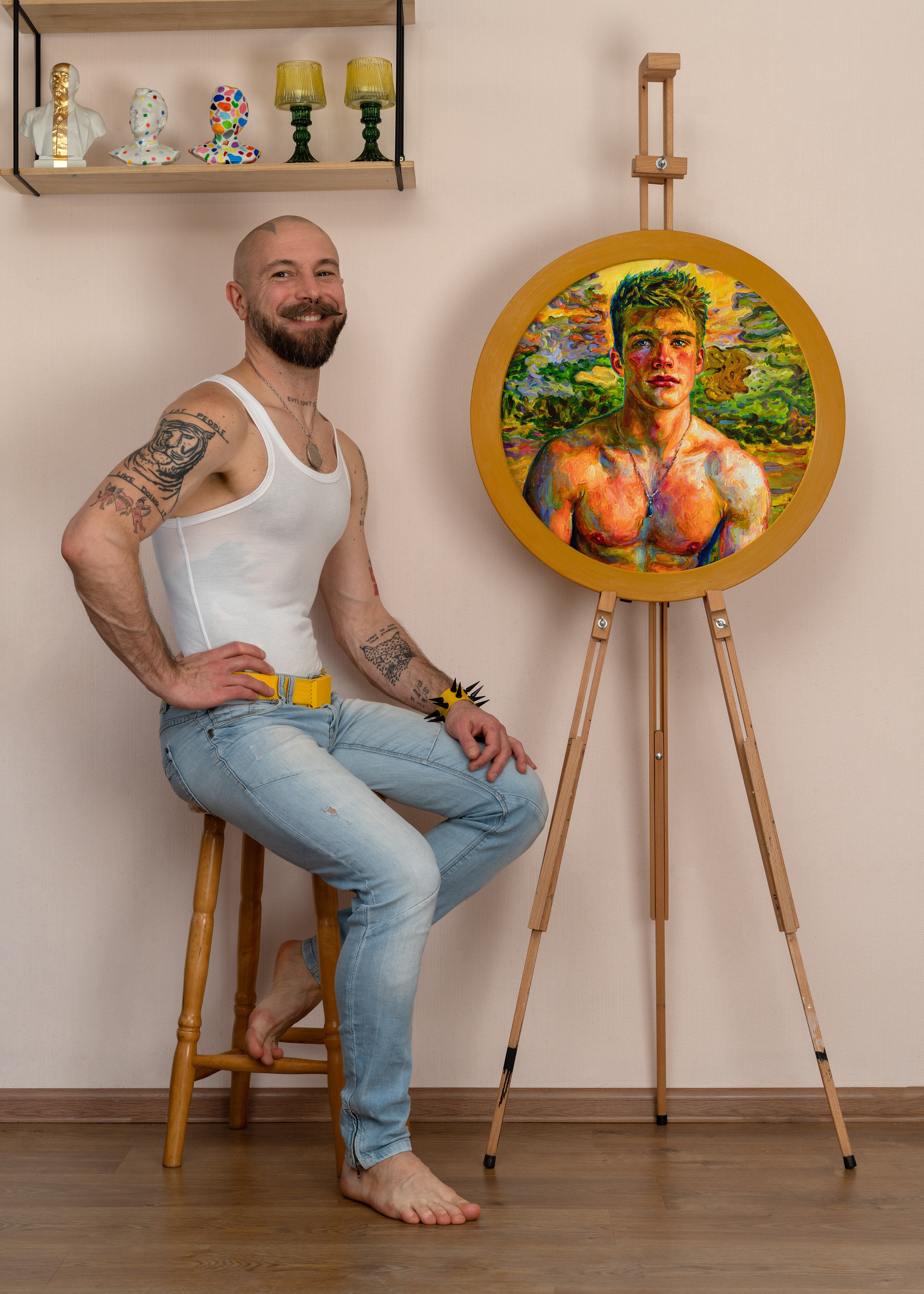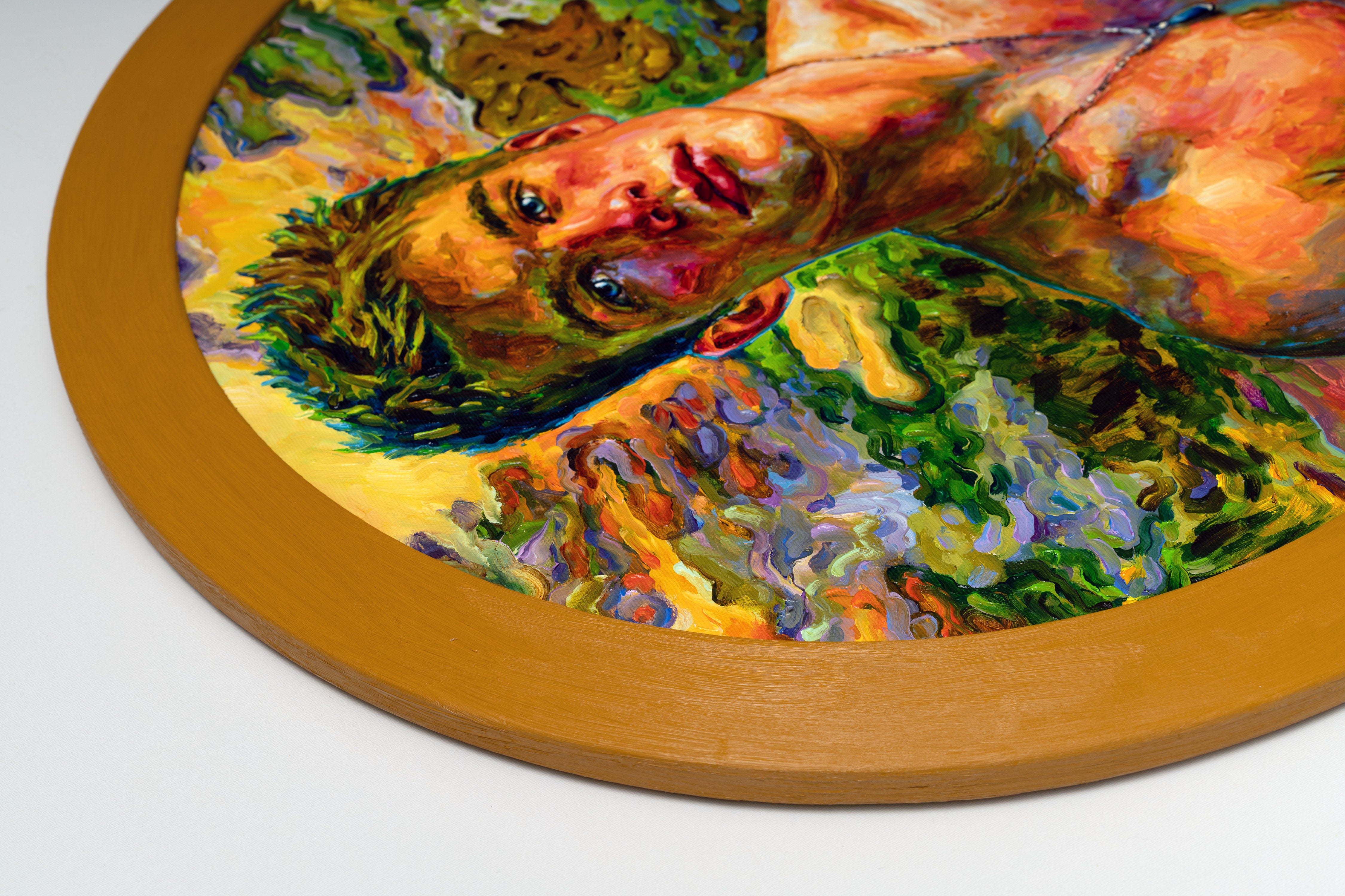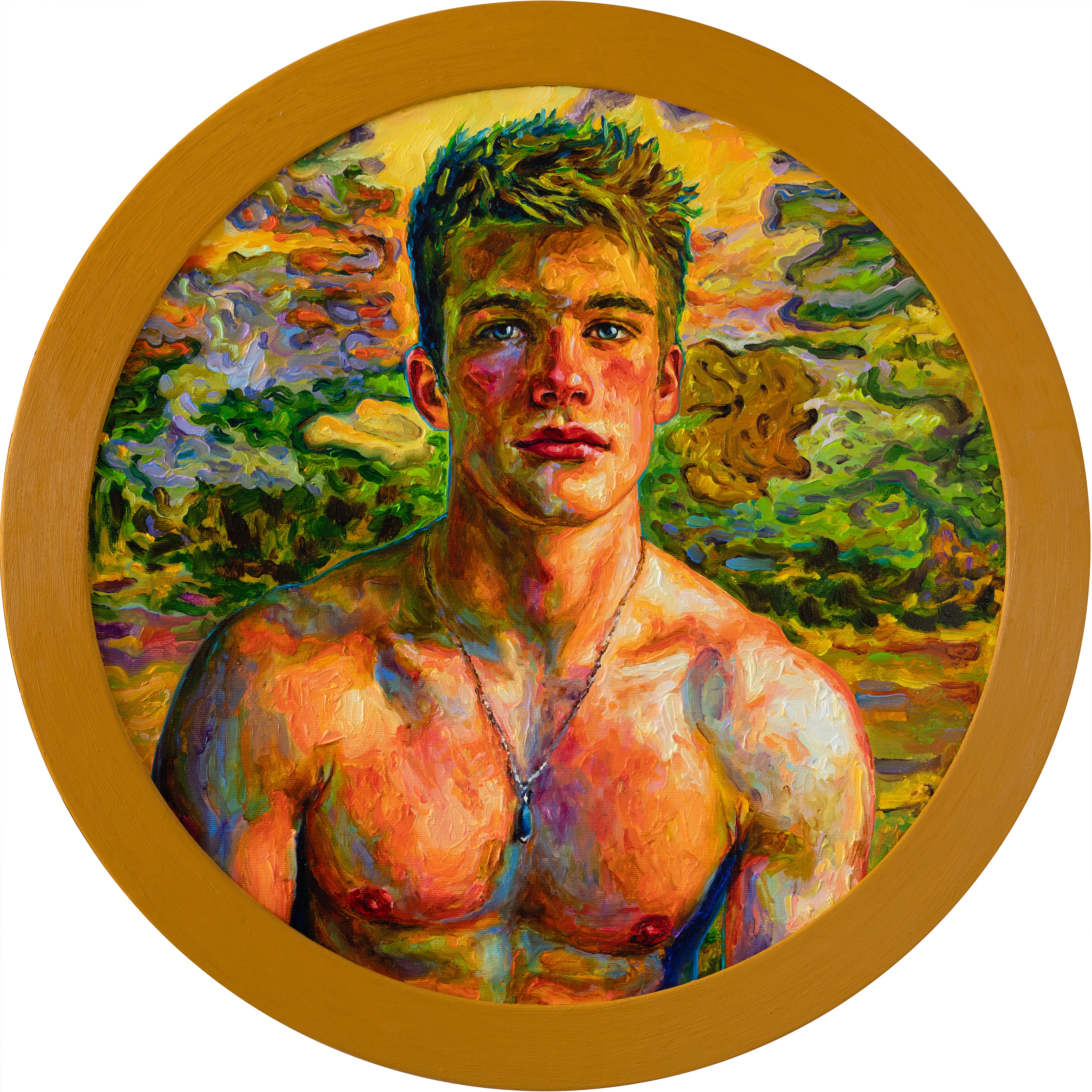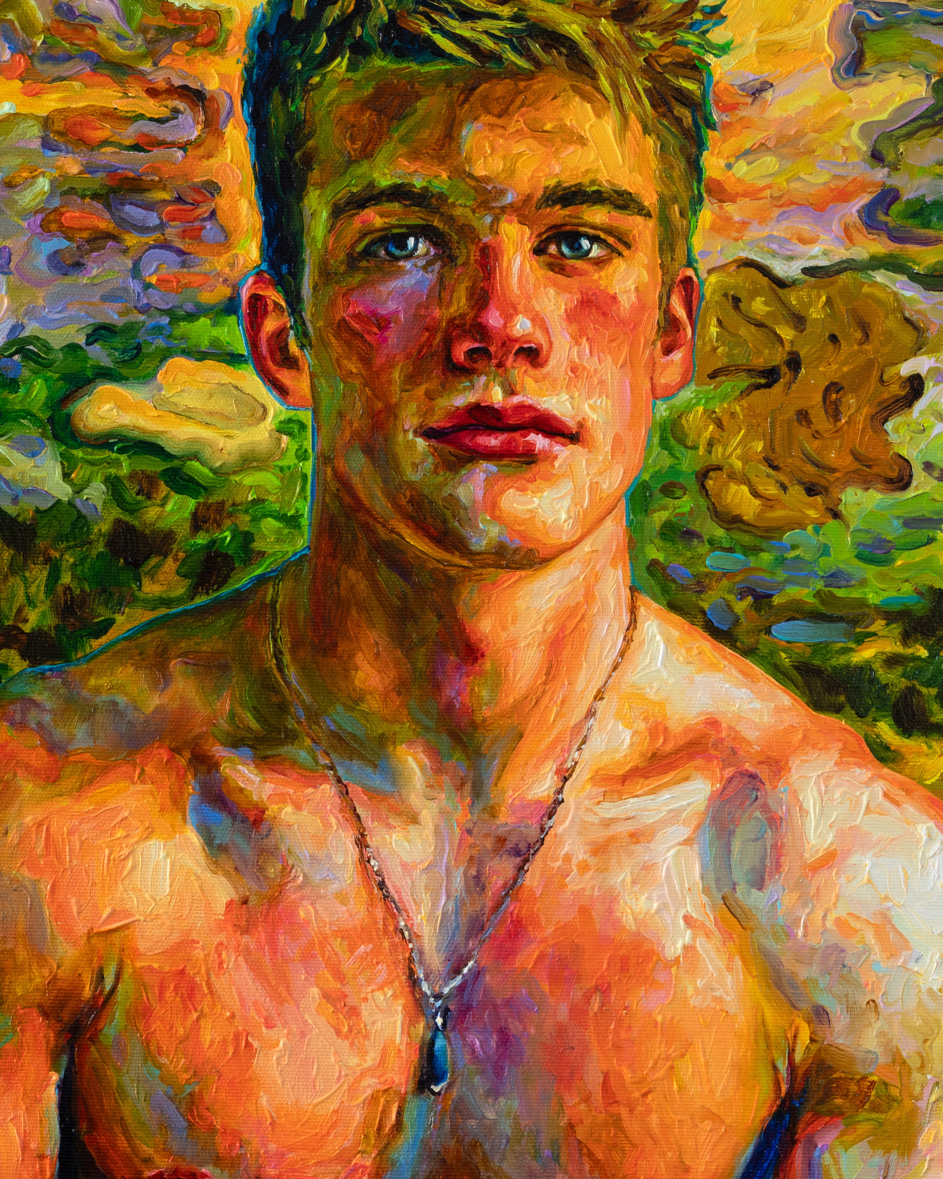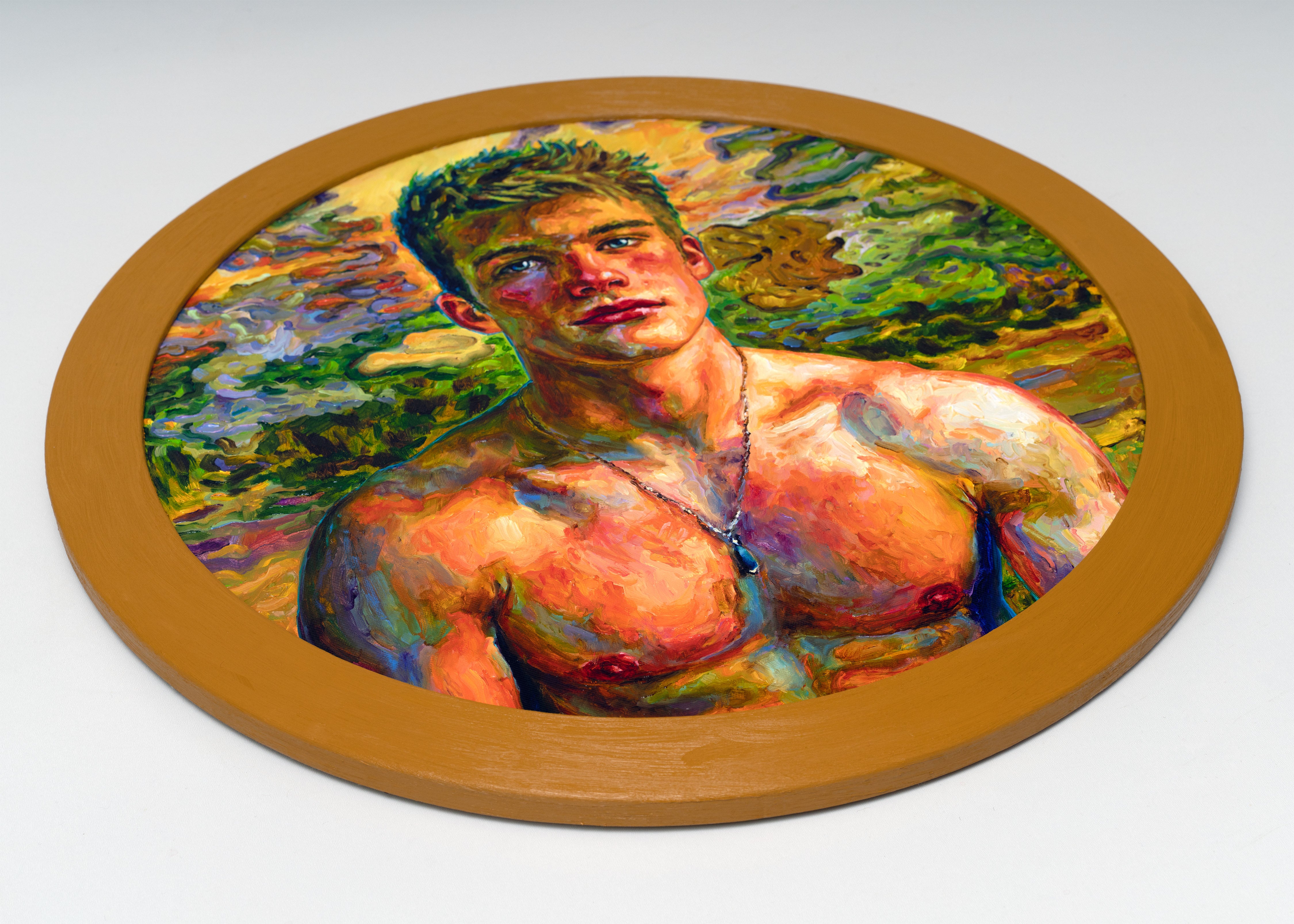 As in much of my work, the painting is also a quiet meditation on male beauty and vulnerability. The young man is not presented as a heroic figure but as a living presence—open, uncertain, and luminous. His nudity is natural, almost incidental, emphasizing the human body as something tender and alive rather than idealized or distant.