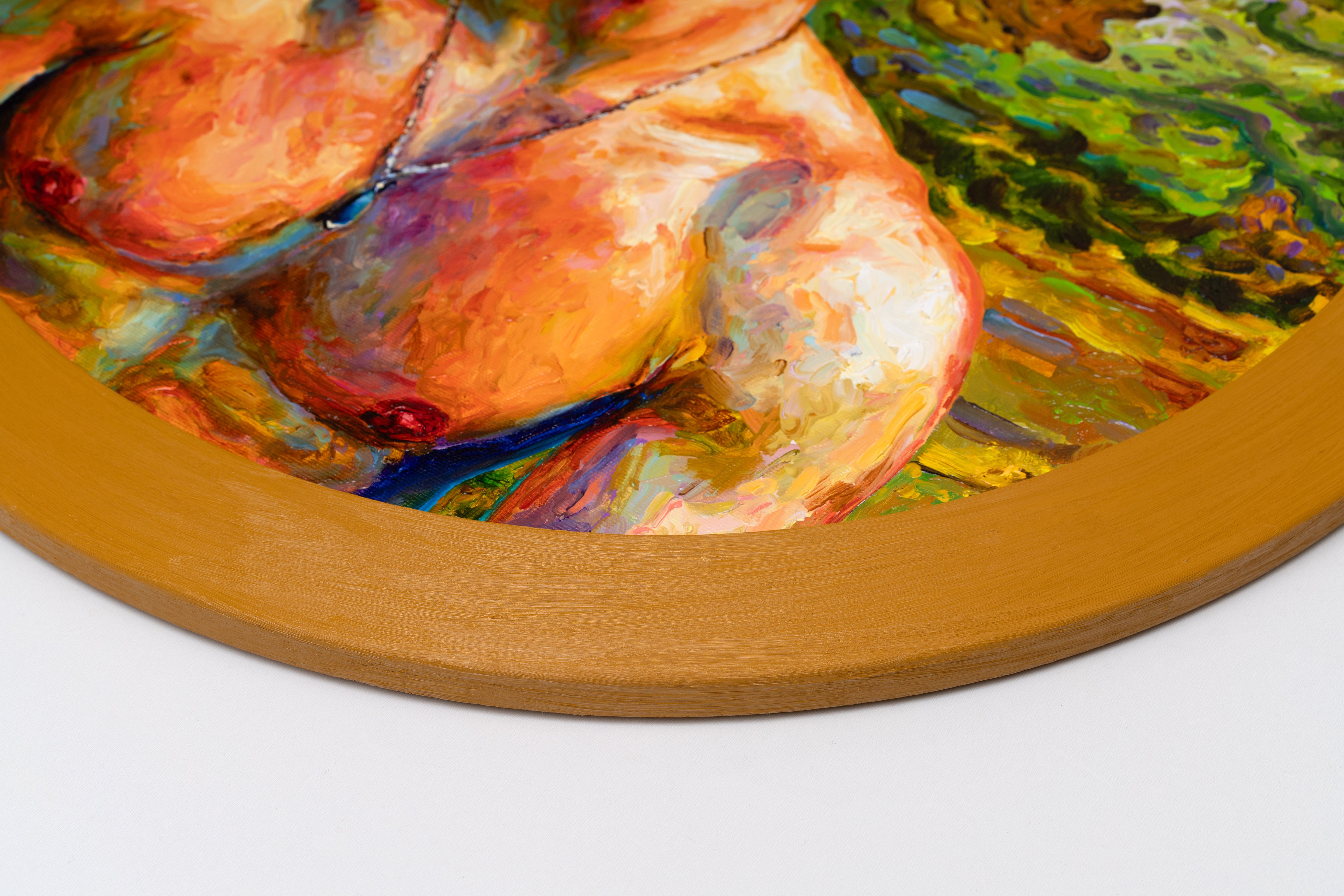 The canvas is mounted on a supported wooden frame and sold ready to hang. The painting is framed with a hand-painted wooden frame. Frame dimensions are 58 x 58 x 2 cm | 22.8 x 22.8 x 0.7 inch. The unframed painting is 50 x 50 cm | 19.6 x 19.6 in. It is signed, titled, and dated on the back.